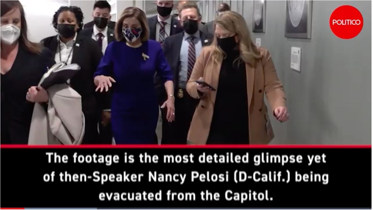 Politico has a good rundown of the previously unaired video footage of Nancy Pelosi during the evacuation of the Capitol on Jan. 6, 2021: