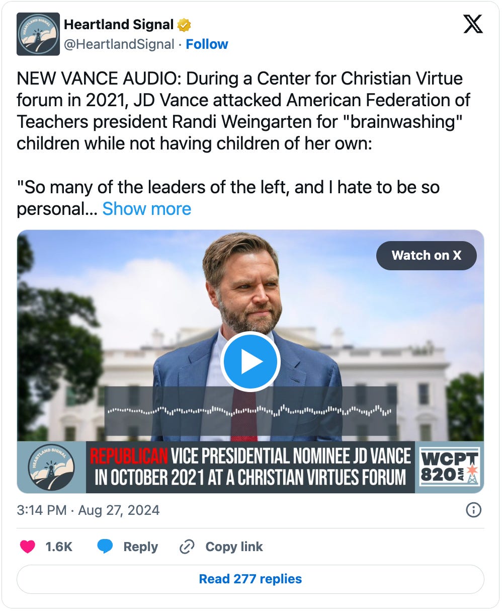Lingering in the background of JD Vance’s peculiar fixation on childless women is an anti-gay animus. The silver lining to another newly resurfaced Vance audio clip is that it much more clearly foregrounds the anti-LGBTQ spirit of his crusade because it targets a favorite right-wing foil: AFT President Randi Weingarten, an open lesbian in a same-sex marriage: