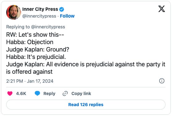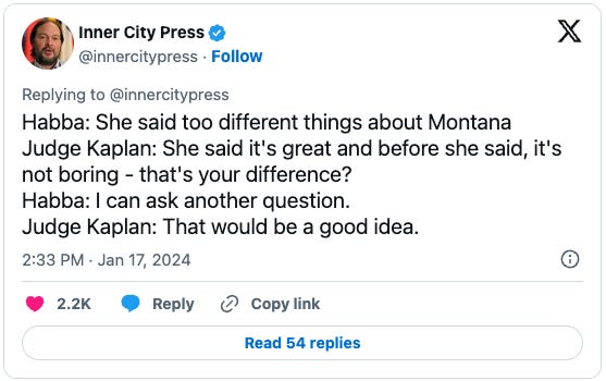 U.S. District Judge Lewis Kaplan, a 79-year-old veteran jurist, shot Habba down so many times that I started to wonder if her misguided strategy was to somehow make the jury hate her more than her client. What good that would do, one can only imagine.