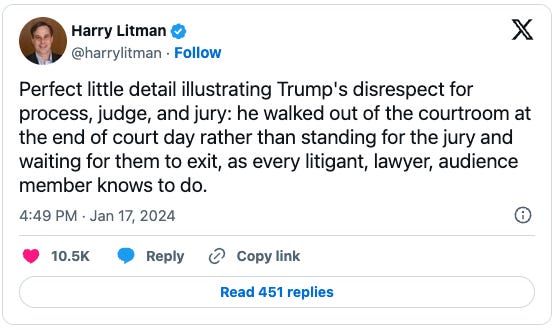 I can’t recall a lawyer having a worse go of it in open court than Trump lawyer Alina Habba did yesterday in the damages trial against Donald Trump by E. Jean Carroll.