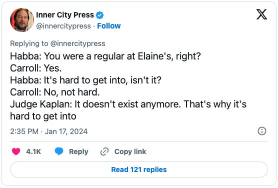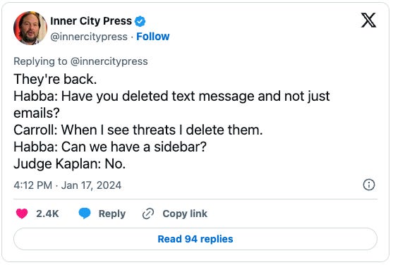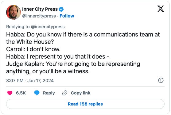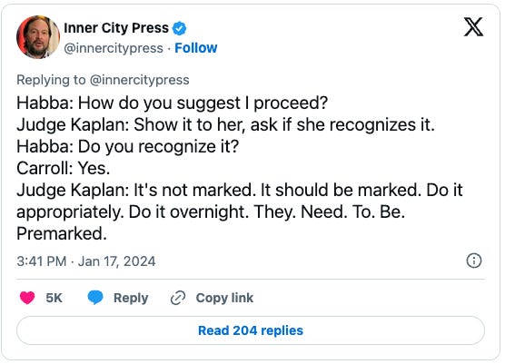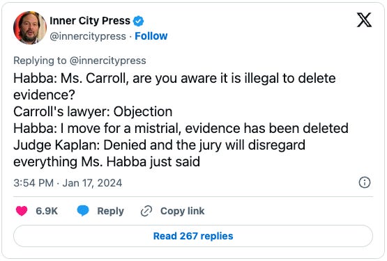 Habba struggled to make proper objections during Carroll’s direct testimony. She struggled to introduce evidence on cross. She struggled with the hearsay rule. It was epically bad.