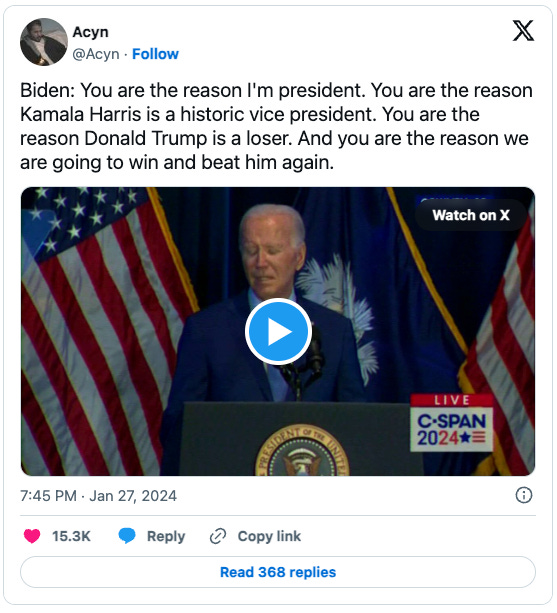 Many messaging experts, including Antonia Scatton (whose Substack is a must-read), have been hammering on this point: that referring to Trump as a would-be dictator only makes him seem stronger to his followers. They insist he should, instead, be called a “loser” at every opportunity--that THAT is the word that maddens and infuriates him. So I’m glad to see that Biden is following this advice--I think we all must constantly do the same.
