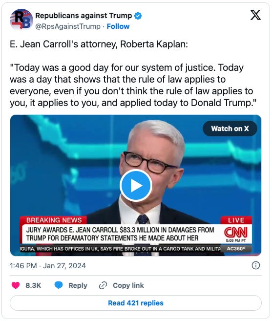 I registered disappointment in some quarters that Carroll’s $83.3 million verdict Friday wasn’t as big in dollar terms as last month’s $148 million judgment in DC that bankrupted Rudy Giuliani. But the two verdicts compare favorably with each other and are arguably quite consistent.