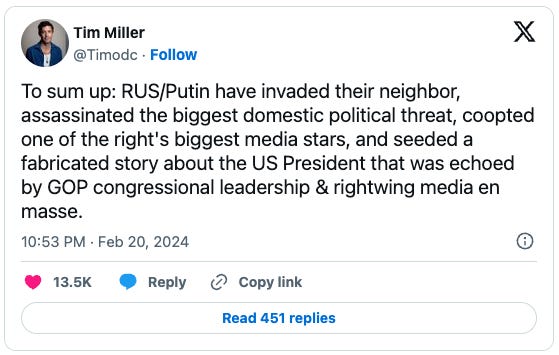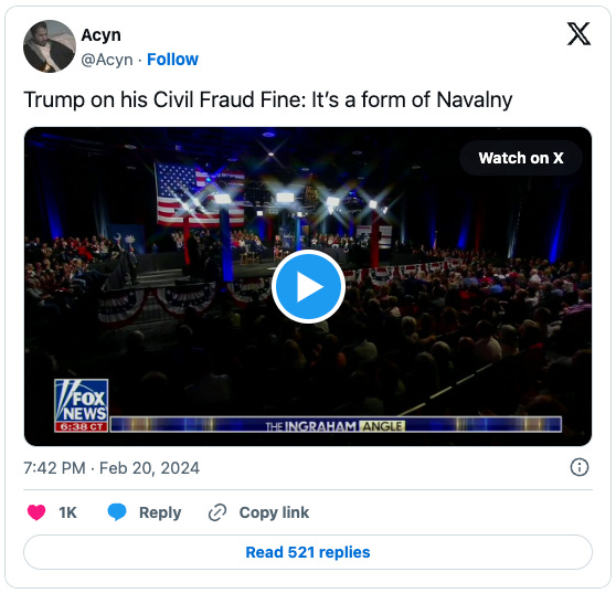 A yuuge lot for commentary, but let me open with this quote lifted from TAP and Harold Myerson's take on tRump likening his "situation" to that of the death of Alexei Navalny: