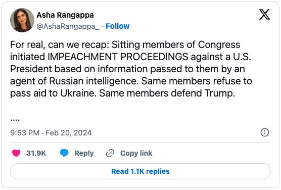 The implications of this Russian operation are staggering, especially for the willing Republicans and right-wing media stooges who were the useful idiots propagating the disinformation for years. The James Comers, Chuck Grassleys, Jim Jordans of the world have been trafficking in this stuff as the purported basis for a Biden impeachment, which is itself tightly yoked to Trump’s campaign for re-election. Right-wing outlets, most notably Fox News, have been amplifying the claims not dozens or hundreds but thousands of times over the past several months.