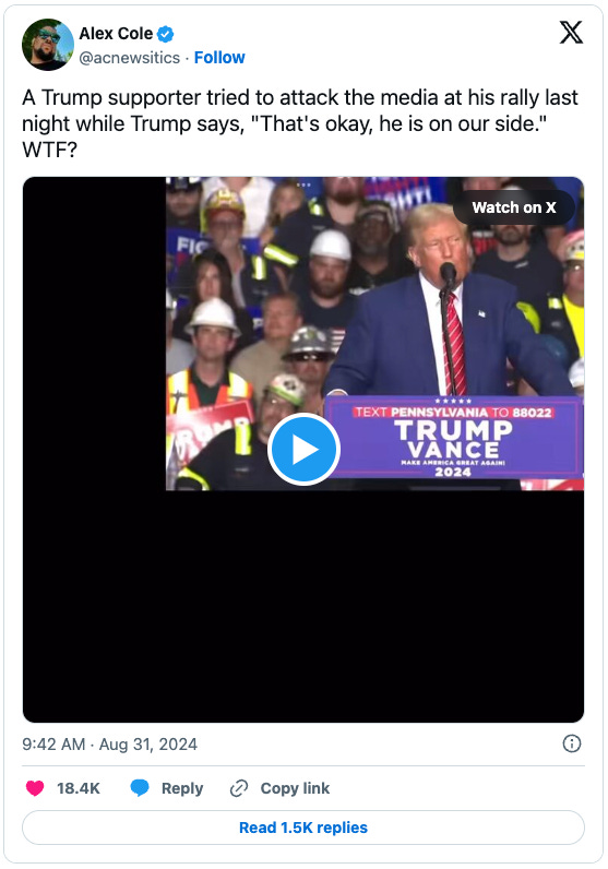 In a Friday incident at a Trump rally in Pennsylvania, a man stormed the press section before being detained by security, while Trump declared from the stage: “He is on our side.”