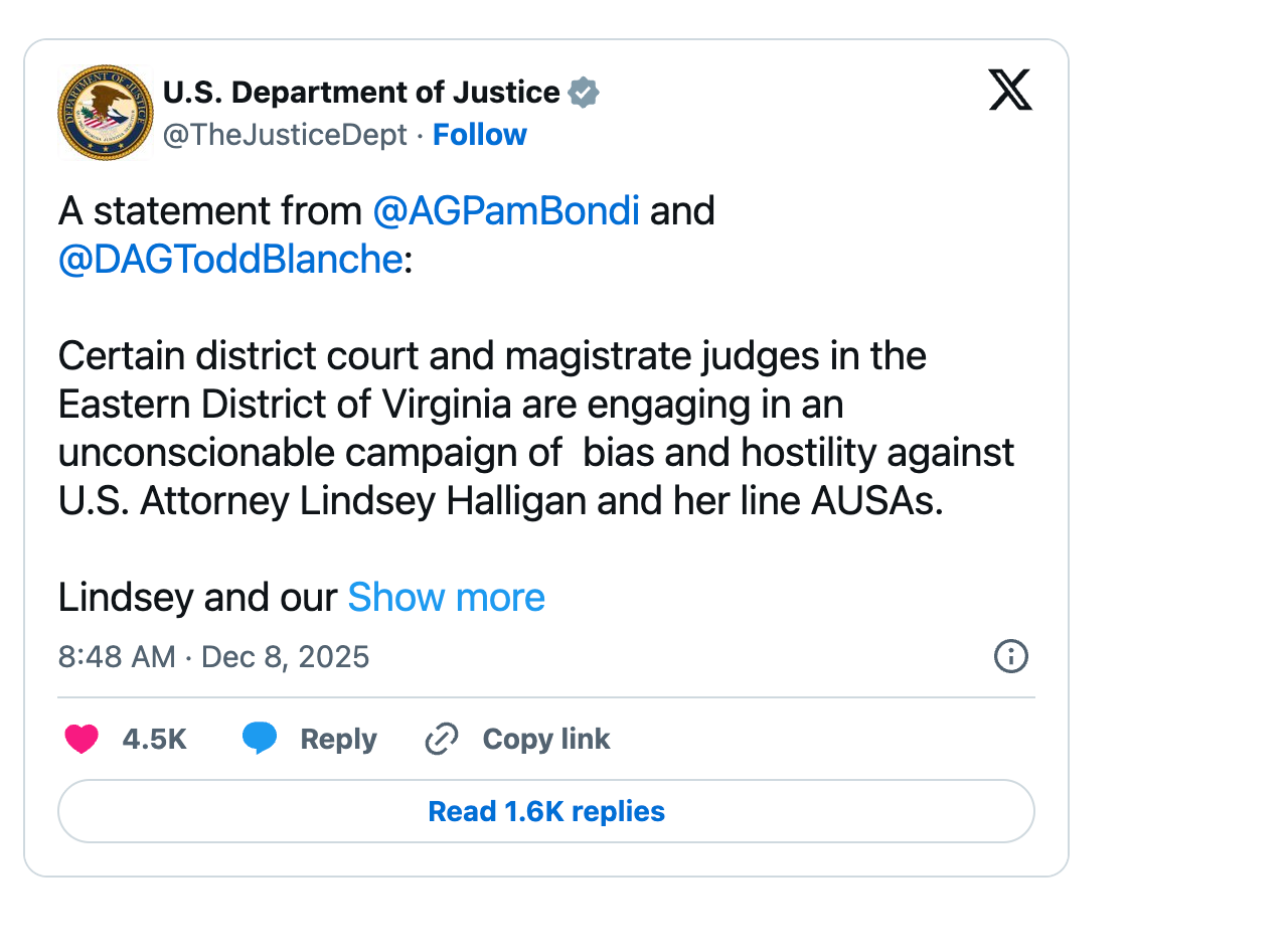 With the Trump DOJ continuing to pretend that Lindsey Halligan is the interim U.S. attorney in the Eastern District of Virginia despite a court ruling that she was invalidly appointed, I don’t know how the district judges can continue not to appoint an interim U.S. attorney, especially with ongoing public attacks on them like this from Attorney General Pam Bondi and Deputy Attorney General Todd Blanche: