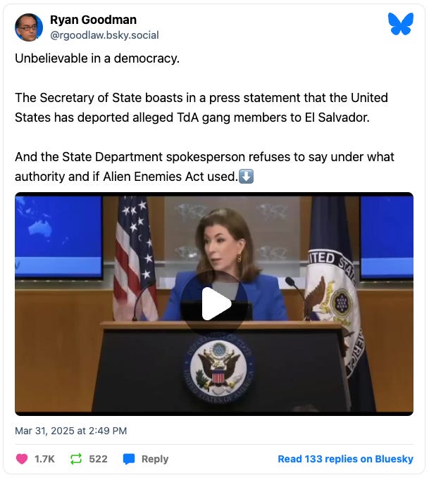 The administration eventually took the line yesterday that the deportations were not carried out under the Alien Enemies Act, according to the NYT: “The official said the deportees were removed under the executive branch’s traditional legal authority to enforce immigration laws against illegal entry, not the Alien Enemies Act.”