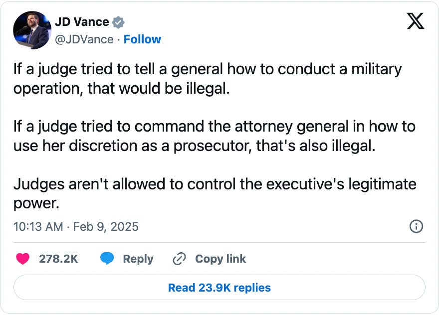 Vance, Musk, Miller and Trump statements about the judiciary may be the most alarming thing they have said to date.