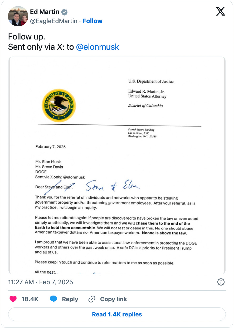 Ed Martin, the acting U.S. attorney in DC, continues to outdo himself, sending yet another love letter to Elon Musk and posting it to social media: