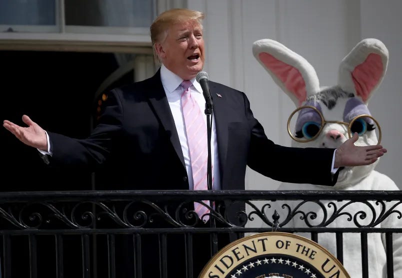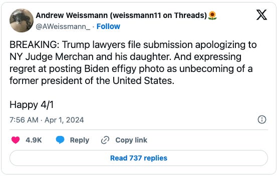 I trust that most of you were offline celebrating the holiday, warming to the Spring, welcoming baseball back, or watching college basketball. Congrats on missing another unhinged online weekend for Donald Trump.