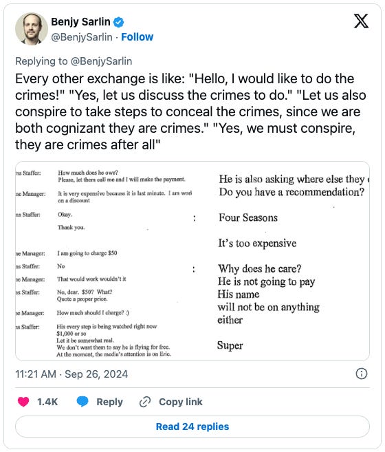 By now you’ve seen the broad outlines of the indictment of NYC Mayor Eric Adams. Five counts – conspiracy, wire fraud, solicitation of a campaign contribution by a foreign national, and bribery – of being a sloppy, brazen idiot.