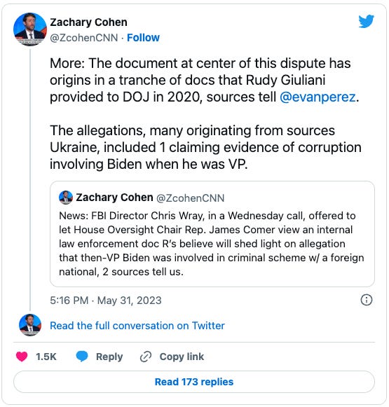 It’s all a bunch of nonsense except for what it shows about the corrupt GOP misinformation factory. In this instance, the document has its roots in the special pipeline Attorney General Bill Barr set up for Rudy Giuliani to funnel misinformation from Ukraine directly into the Justice Department, and now Comer is using it all these years later to attack Biden, as originally intended: