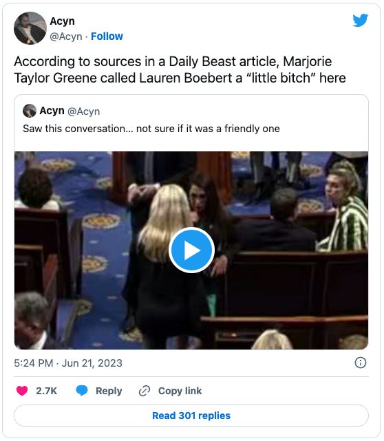 The Daily Beast reported some of the details of the kindergarten-level exchange, in which Boebert confronted Greene over mean things she said about her and Greene accused Boebert of copying her articles of impeachment against Biden: