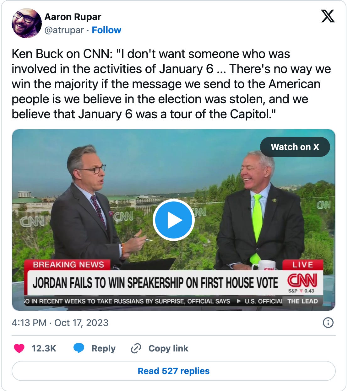 I have been dumbstruck by the rebranding of Ken Buck as a moderate voice of reason as well. Though I do take note of commenter Janet CO-West Slope's observations as someone who is closer to Buck's district. Maybe he's ready to go out, and this is his Moment of Zen before he's primaried?