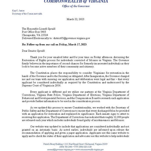 Gov. Glenn Youngkin quietly announced in a letter to state lawmakers last week that he is, essentially, giving himself the power to pick and choose who gets to vote and who doesn’t in Virginia moving forward. The move applies specifically to previously incarcerated individuals.