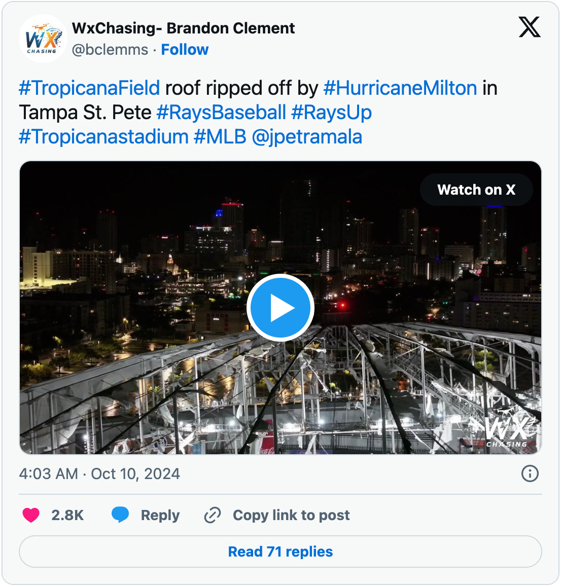 The defining image of Milton may be the destruction of the roof of St. Petersburg’s Tropicana Field, home of major league baseball’s Tampa Bay Rays and a planned staging area for electric utility lineman and first responders: