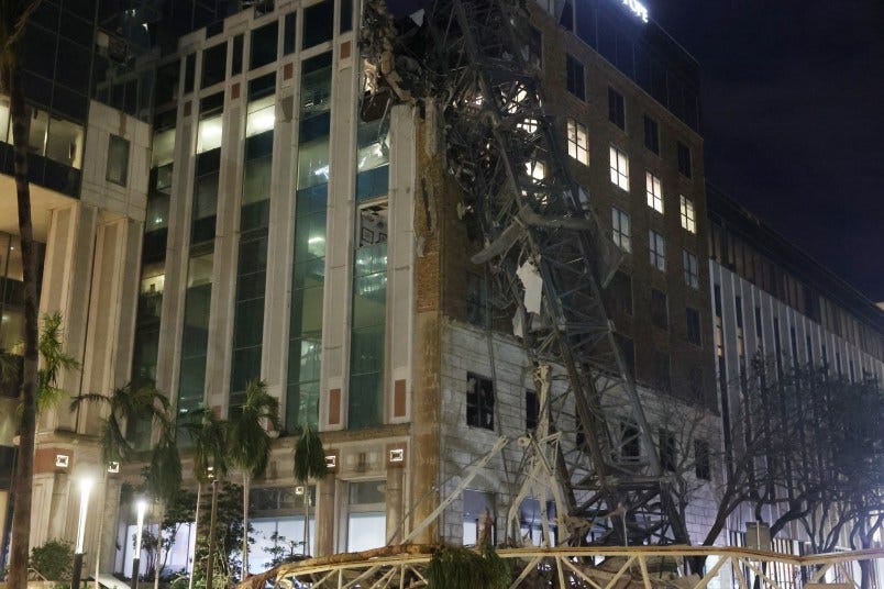 A tower crane in St. Petersburg collapsed during the storm and fell into the building that houses the Tampa Bay Times. No injuries were reported. With not enough time to dismantle tower cranes before the storm arrived, warnings had been issued in advance to those near cranes, including the one that collapsed.