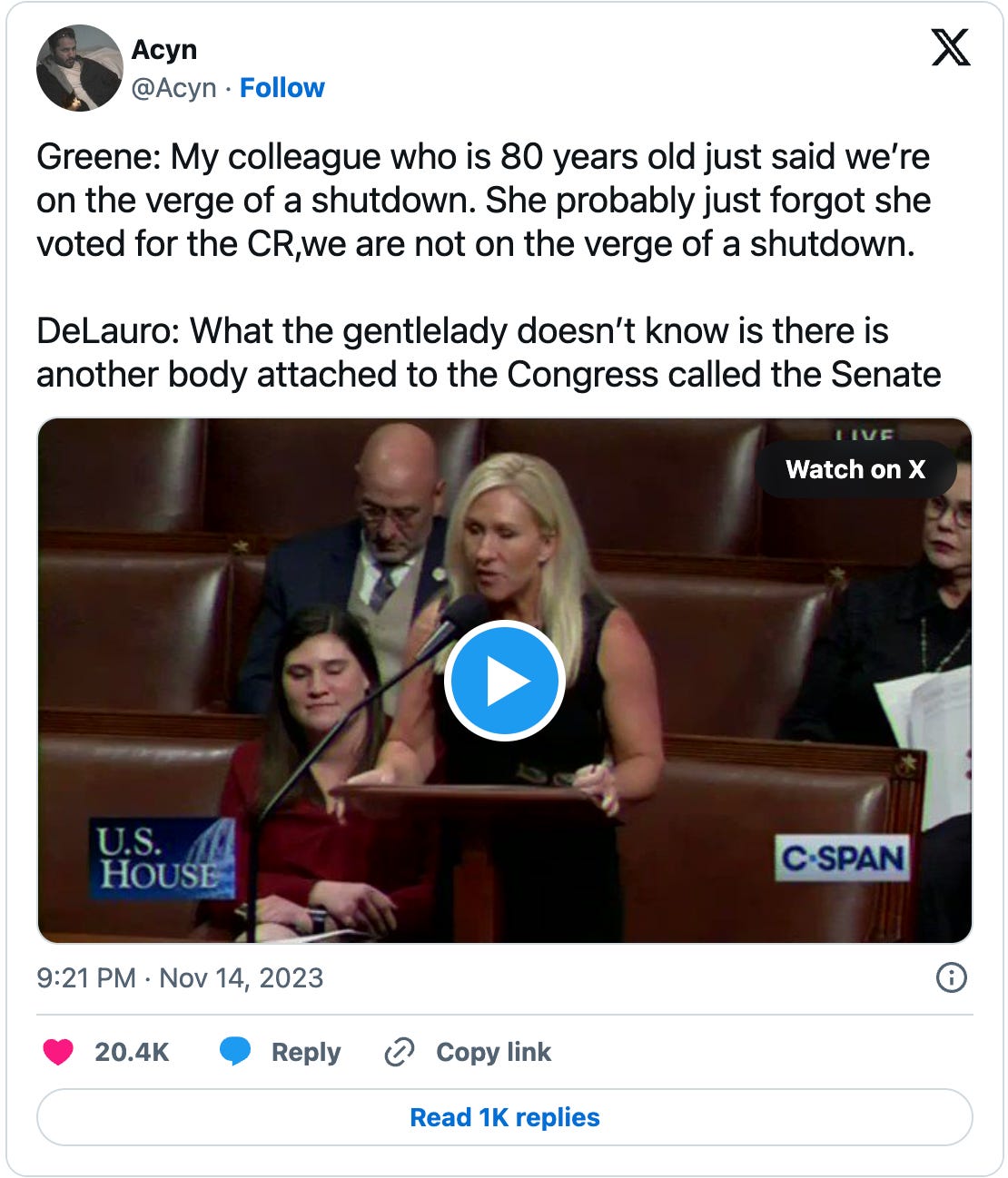 Despite the extracurricular antics I will describe further down, the House managed to avoid a government shutdown by passing a continuing resolution with more Democratic support than Republican. The Democratic-controlled Senate is expected to concur, and President Biden is expected to sign it.