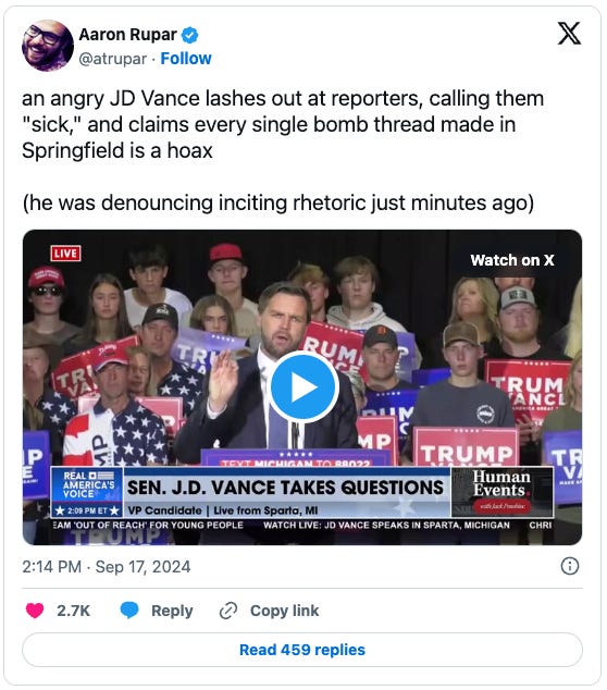 JD Vance’s apparent logic – that the GOP ticket can only be blamed for actual bombs not bomb scares, and that any reporting on bomb threats is a lie and fake news – serves merely as pretext for attacking the messengers: