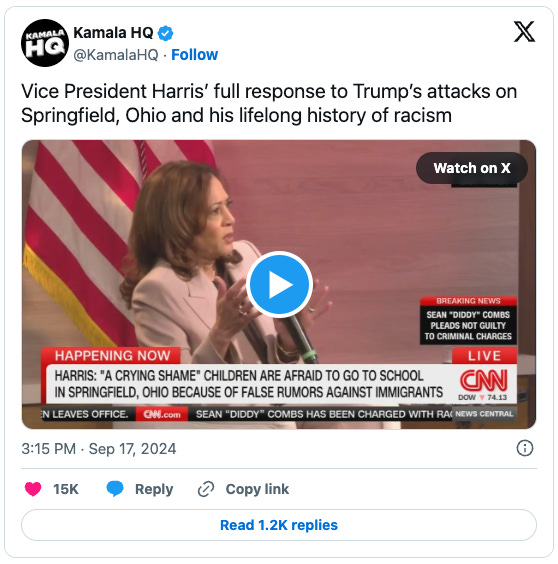 What remains a challenge to the media coverage and the national conversation is that Trump’s point isn’t about “eating pets,” or Haitian immigrants, or Springfield. It’s about othering entire segments of the population, largely based on skin color and national origin. It’s about stoking fear in white people about these “others.” And it all reverberates and echoes in the context of othering Harris herself, whose bi-racial identity Trump hasn’t hesitated to highlight in a disparaging way.