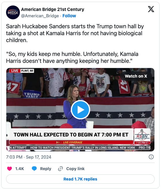Arkansas Gov. Sarah Huckabee Sanders, at a Trump town hall event in Michigan yesterday, engaged in another pernicious way of othering Kamala Harris:
