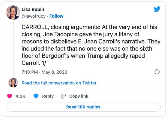 Closing arguments concluded yesterday in the civil rape and defamation trial of Donald Trump, and the jury is set to begin deliberations today. No big surprises in closing arguments. Here’s a good succinct thread summarizing the day: