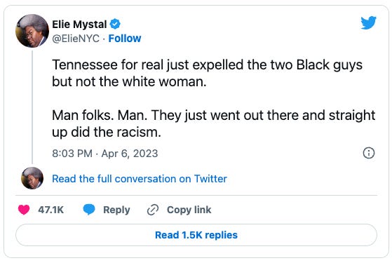 Rather than expelling all three Democratic members it targeted for protesting school shootings, the GOP House only expelled the two young Black male members and left the older white woman alone.