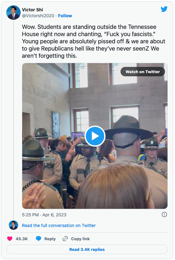 3. The Tennessee GOP is going on about the "disorder" brought to the house by the protests of the Tennessee Three. According to the speech by Justin Jones, after refusing to recognize the group the Speaker put the house in recess immediately. Are there rules about people talking during a recess? (Clearly a rhetorical question, but as a technical matter I am curious.)