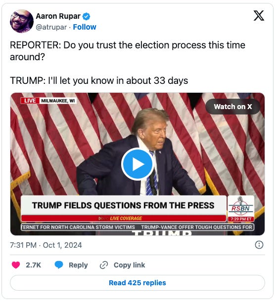 Re: debate...although Tim Walz got off his best line of the evening when he pressed Hillbilly into a non-answer on the legitimacy of the 2020 election, it barely drew a response from the MSM coverage I've read. Perhaps because Walz's probing came late in the proceedings, and reporters were on their way to the spin room, I would have thought that "election denialism" would have drawn more attention...silly me.