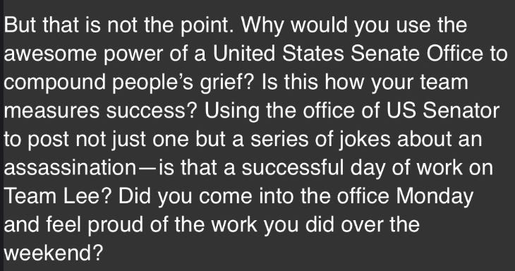 Sen. Mike Lee (R-UT) was among the worst culprits of trying to muddy the waters around the weekend assassination spree of Vance Luther Boelter in Minnesota – and Sen. Tina Smith (D-MN) was having none of it.