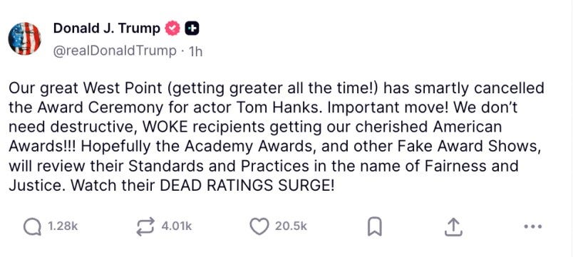 U.S. Military Academy: An alumni group at West Point canceled an award ceremony for actor Tom Hanks scheduled for later this month. It’s not clear if the award for Hanks, which was announced in June, has been revoked. “[T]he planned celebration appears to have run headlong into Trump-era politics,” the WaPo reports. In addition to being a big backer of a number of military and veterans causes, Hanks has been a public supporter of Joe Biden and was awarded a Presidential Medal of Freedom by President Barack Obama. While no reason was given for the cancellation, President Trump have away the game: