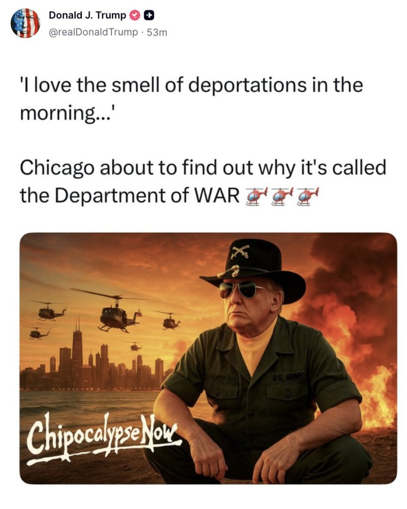 Not Normal... This meme and the comment from Hegseth should upset every American down deep into our souls. So Trump, who is begging for the Pulitzer Peace Prize is declaring war on Americans as well as foreign countries? I read a great article in the Guardian by Sydney Blumenthal about this insane idea Trump is worthy of any such honor.