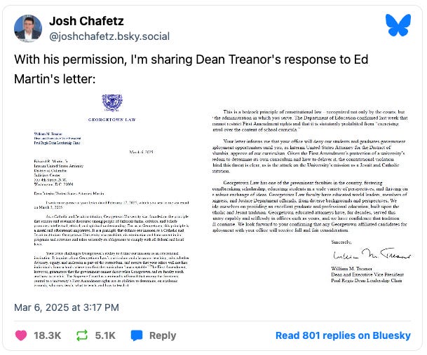 Georgetown Law School Dean William Treanor sent a steely letter back to acting D.C. U.S. Attorney Ed Martin, who bumbled his way into a First Amendment minefield by threatening to blackball the university’s students if it didn’t drop all DEI efforts: