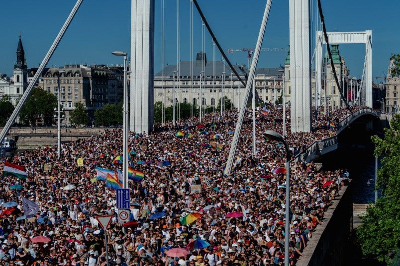 Hungary’s innovative authoritarian leader, Viktor Orbán, threatened “clear legal consequences” for anyone who took part in Budapest’s parade on Saturday. That threat only turned the LGBTQ celebration into a protest against his government. More than 100,000 people showed up. Law enforcement stood by passively.