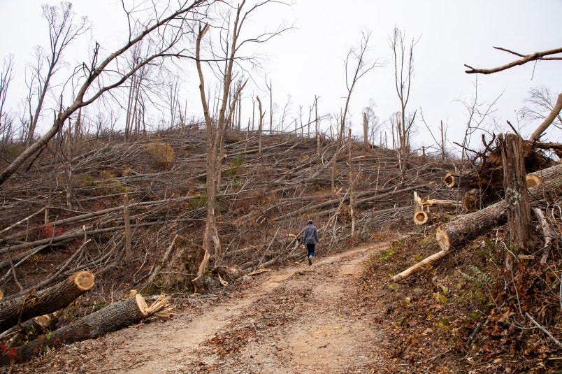 that Post story about our loss of trees bc of Helene...I'm in Asheville. we're still seeing the Biblical-disaster-level damage in bits and pieces. just read that we lost 20 percent of our trees. hard to convey the grief and desolation of it. hard to get your mind around. our house wasn't damaged but a mile away Biltmore Village was under 20 feet of water. everywhere you turn are piles of fallen trees and their debris. feels like we're suffering the consequences of two unforeseen, massive catastrophes: first Helene and now the election.