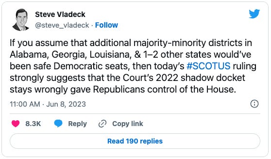 Were it not for the Trump indictment, Morning Memo would have led today with the voting rights case out of the Supreme Court yesterday, but in particular the way the court used its shadow docket to let Alabama run the 2022 election with a racially discriminatory congressional map and how that helped Republicans win a narrow majority in the House. It’s incredible … really: