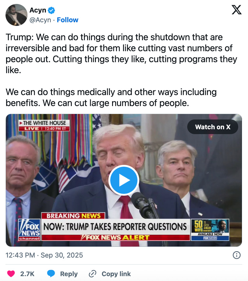 Trump posted on social media this morning that OMB Director Russ Vought is going to seize on the shutdown not just to impose the widespread layoffs previously threatened but to dismantle more government agencies. Predictably, the administration already took advantage of the shutdown to shutter Voice of America (which has stayed on air during past shutdowns), a convenient runaround on a judge’s order to reinstate fired workers and restore programming.