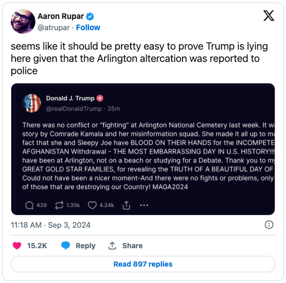 Not only did it not happen but the story was “made up,” Trump claimed, by “Comrade Kamala and her misinformation squad.” It was, in Trump’s telling, just a “BEAUTIFUL DAY OF HONOR” with “no fights or problems.”