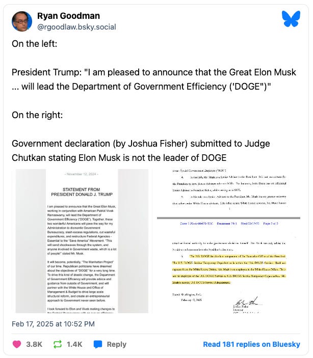 In an overnight filing, the Trump administration has made the incredulous claim to U.S. District Judge Tanya Chutkan in DC that Elon Musk is not running DOGE. It doesn’t take much to find contrary evidence: