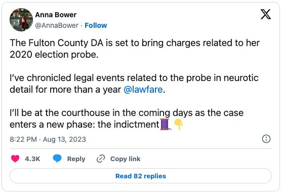 All signals are pointing to a state grand jury indictment tomorrow (Tuesday) in Atlanta District Attorney Fani Willis’ long-running investigation of Trump’s interference in her state’s 2020 election. Here’s a good rundown on why we expect indictments tomorrow: