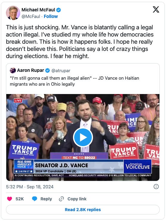 In a troubling sign of how the xenophobia at play here may be yoked to the powers of the federal government in a Trump II presidency, Sen. JD Vance (R-OH, ironically) insisted on continuing to call the Haitian immigrants in Springfield, Ohio “illegal aliens” even though they are legal immigrants.
