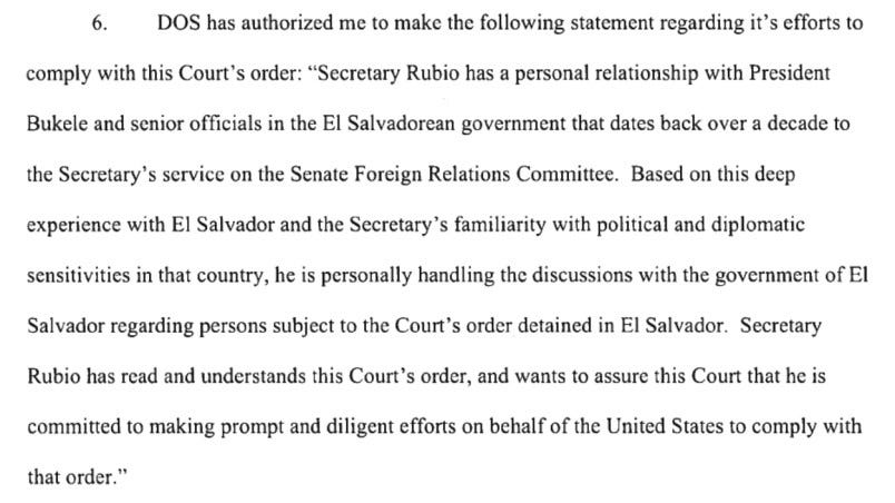 The Trump administration attempted to cure last week’s violation of the judge’s order by filing an updated declaration by an ICE official on the steps the government has and will take to facilitate Cristian’s return. The updated declaration is still remarkably thin and not based on personal knowledge of the government’s actions, as the judge ordered. It also appears to be an attempt to place the entire case more firmly in the foreign policy realm and out of the reach of the judiciary by highlighting Secretary of State Marco Rubio’s personal involvement in “handling the discussions” with the government of El Salvador: