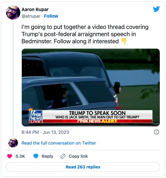 This was one of the best round ups. You pulled together so many threads and amidst the insanity, focused on some hopeful points that have eluded me elsewhere in my readings. Thanks. I loved the lawfare link.. it was good for a laugh, and for accessing a “glimpse” inside this most important time and place. The Jack Smith steely stare and tireless activity are reassuring. Go Jack, go. I’ve been wondering about the Bedminster connection and hoping there might be follow-up there so thanks for the link. The lava thing is really cool too!