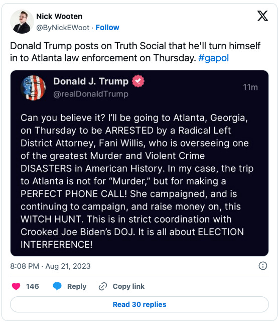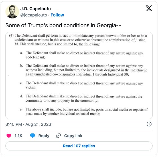 No release on his own recognizance for Trump in Georgia. He must post a $200,000 bond and submit to the following conditions of pre-trial release: