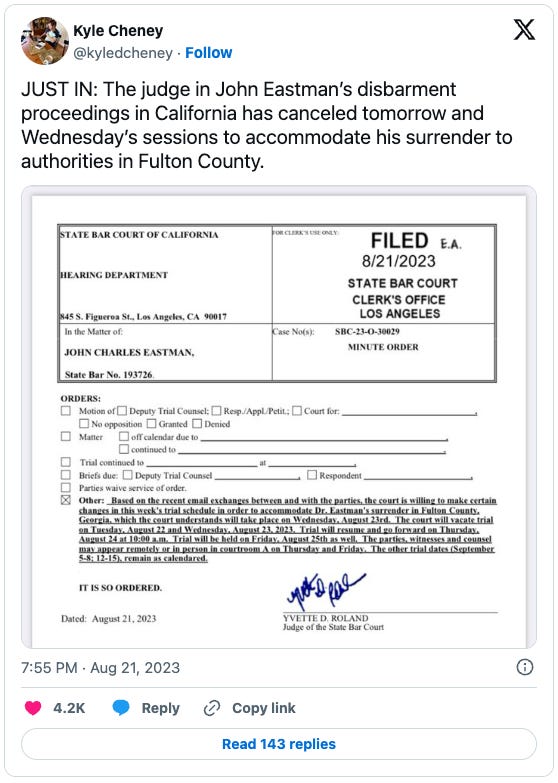 Coup architect John Eastman failed to in his bid to postpone his disbarment proceedings in California on account of his indictment in Georgia, but he has won a small delay … so that he may surrender on the Georgia charges lol: