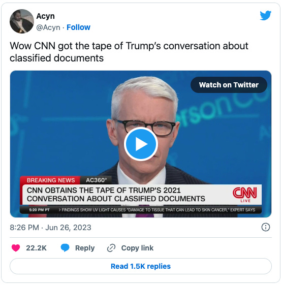CNN has obtained the audio recording of former President Donald Trump at Bedminster in the summer of 2021 apparently showing off classified documents to people without proper security clearances. It’s everything you could have imagined, plus a little more.