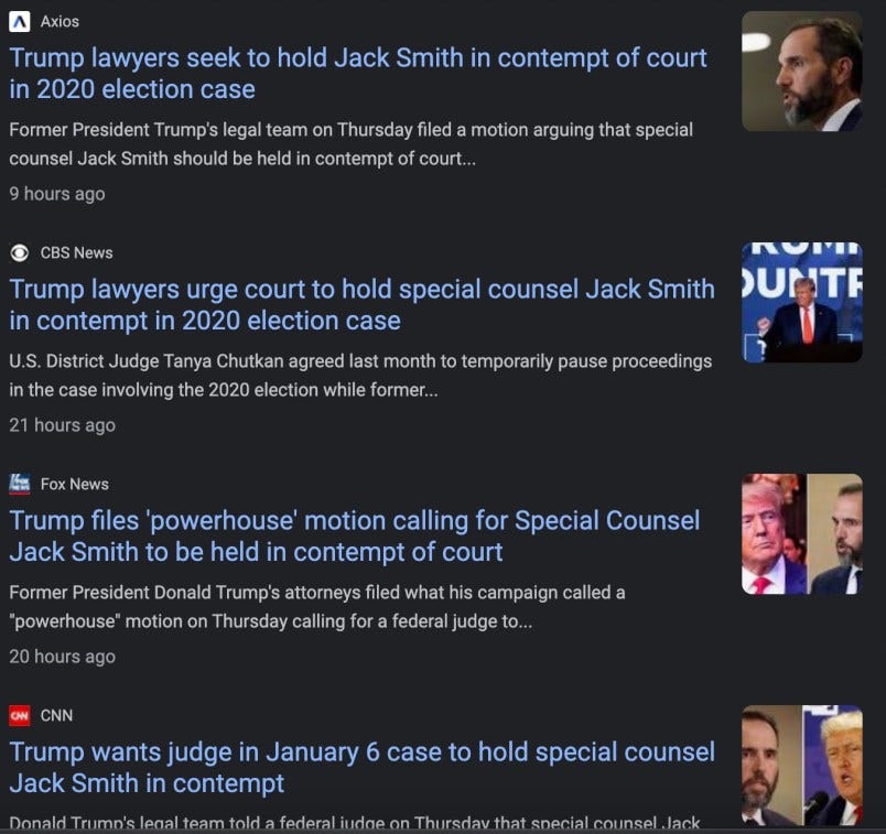 Most legal observers think this motion is going nowhere, but that’s probably not the point of this exercise. As Ryan Reilly noted, the Trump motion “appears intended to get ‘Jack Smith’ and ‘contempt’ in a bunch of headlines.” It worked: