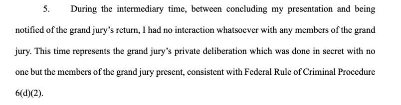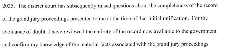 Halligan’s declaration clarifies some but not all of what happened in the grand jury proceedings. I had been assuming that after the grand jury returned the no-true bill as to one of the counts that Halligan would have gone back into the grand jury room and presented an alternative indictment on the two counts that they ultimately charged Comey with. But, according to her declaration, she had no further contact with the grand jury before it returned the two-count indictment.