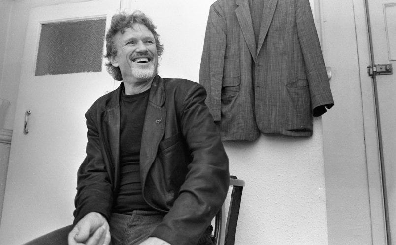 I have an offbeat amalgam of mental snapshots of him: flying helicopters offshore for the oil and gas industry from my hometown while he wrote “Me and Bobby McGee,” which Janis Joplin would make famous posthumously; the trucker in the Sam Peckinpah movie based on the novelty song “Convoy” that defined the big rig craze of the 1970s; a member of the supergroup The Highwaymen in the 1980s along with Johnny Cash, Willie Nelson, and Waylon Jennings; his fabled confrontation with Toby Keith backstage at Nelson’s 70th birthday party in 2009, that Ethan Hawke famously described and that Kristofferson himself said he had no memory of.